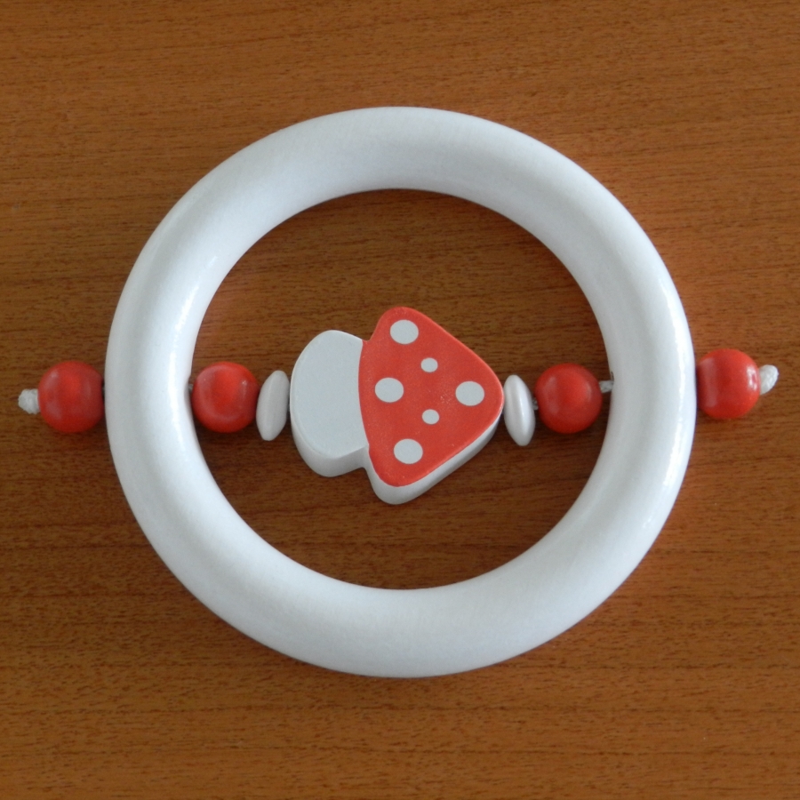 Dieser Greifling ist ein ideales Spielzeug für Babies. Damit können sie stundenlang spielen. Es wurde aus Holzperlen und Holzring hergestellt. Der Durchmesser beträgt 8.5 cm.
