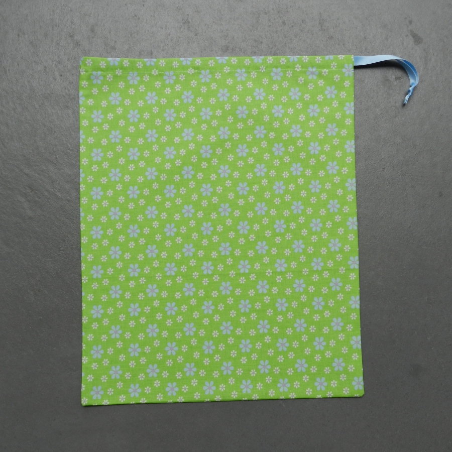 Süsses Wäschesäcklein grün mit Blümchenmotiv. Praktisch für den Alltag oder für auf Reisen. Baumwolle, hellblaues Satinband, Waschbar. Masse ca. 28x35cm.